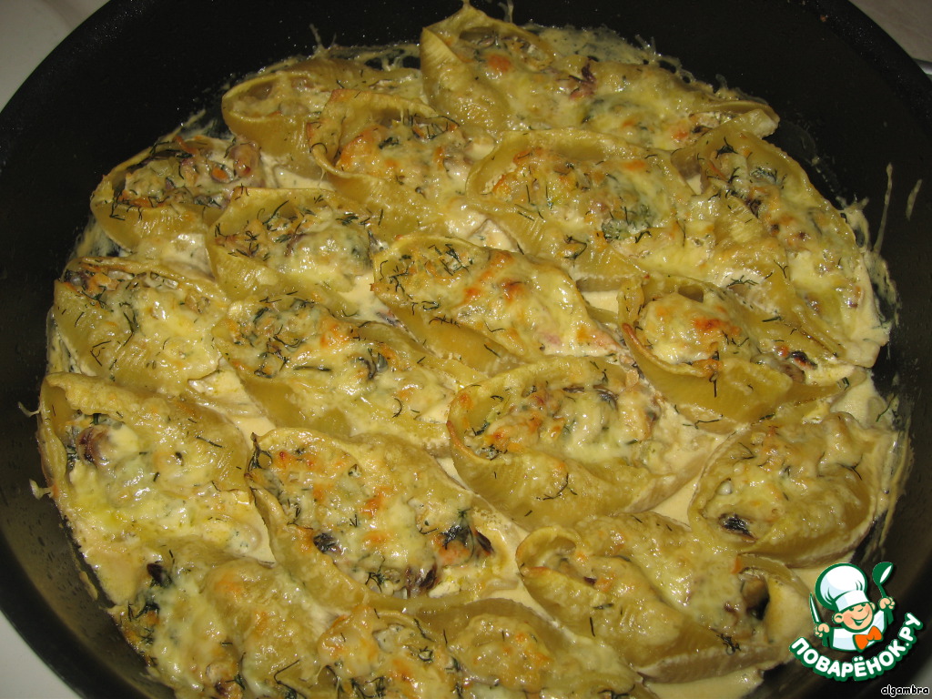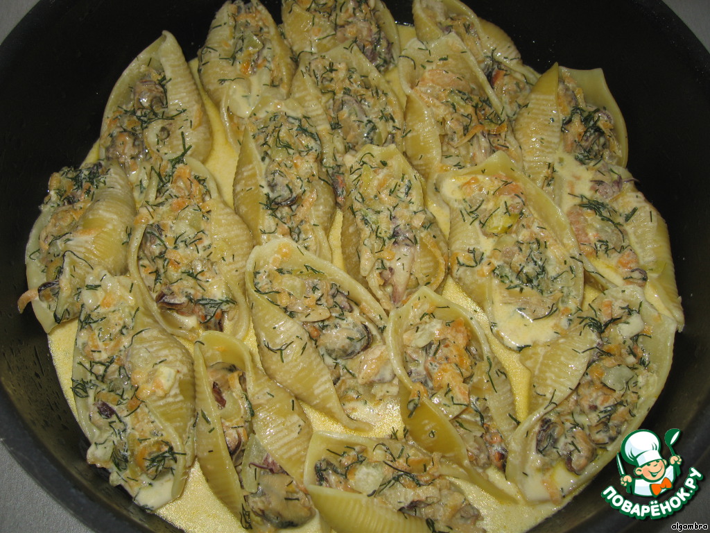 | Конкильони, фаршированные морским коктейлем в сливочном соусе. |