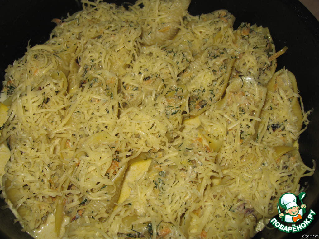 Трем сыр на мелкой терке и посыпаем конкильони. Отправляем все в разогретую духовку на 10 минут.