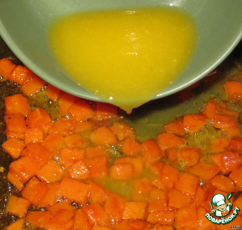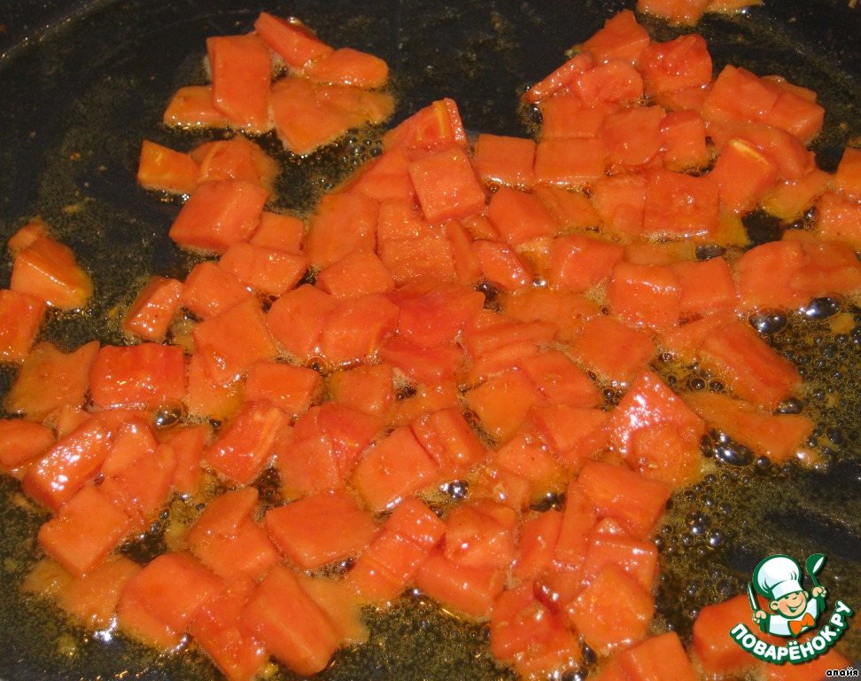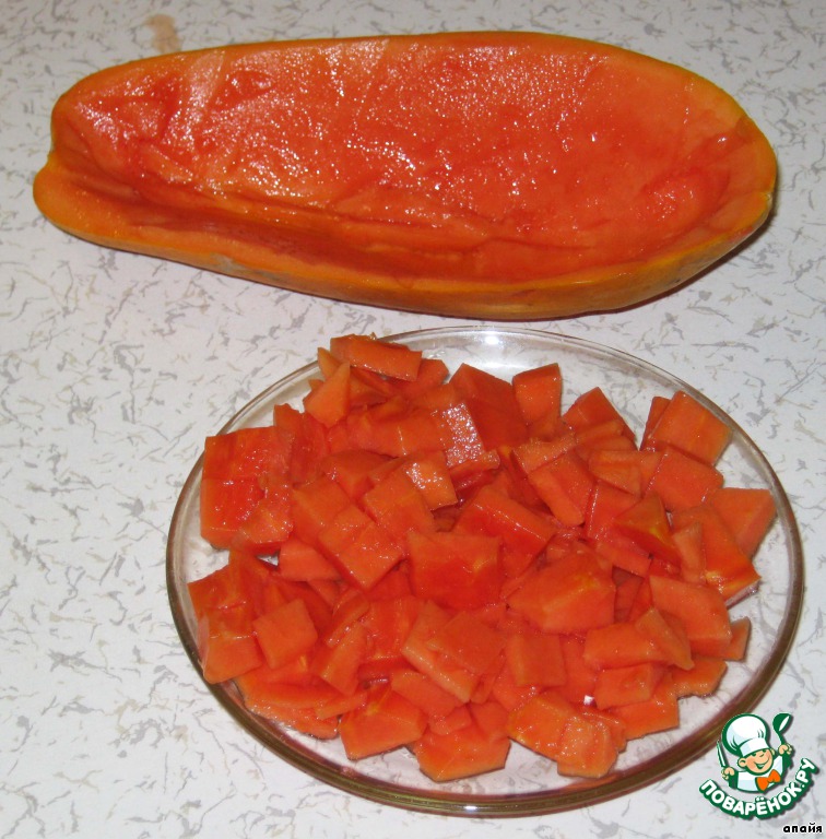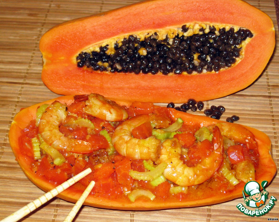 В качестве емкости для подачи использовать кожуру от папайи, аккуратно очищенную заранее.