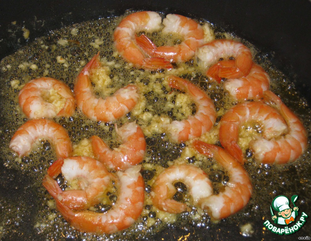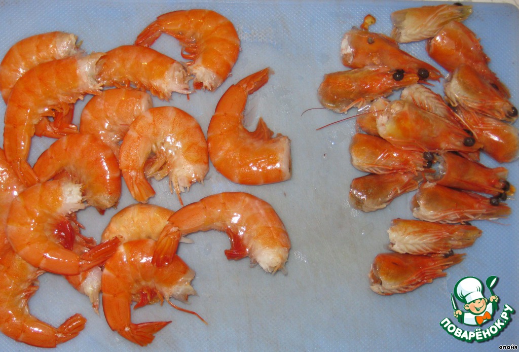Креветки очистить от панциря и головок, оставить только хвостик.