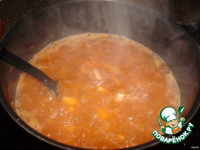 Добавляем томат-пасту, макароны (маленькие рожки),