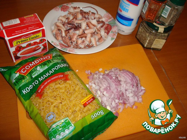 | Просмотрев все рецепты первых блюд из морепродуктов, пришла в удивление, можно найти все, кроме... осьминога. Tак вот, сегодня у нас на первое осьминог с макарошками. Приступаем... |