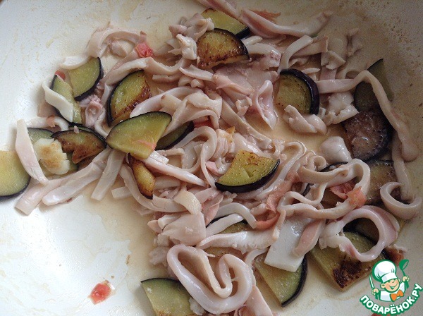 Очень советую баклажан класть побольше, уж очень вкусны они, когда пропитаются соусом и соком кальмара.