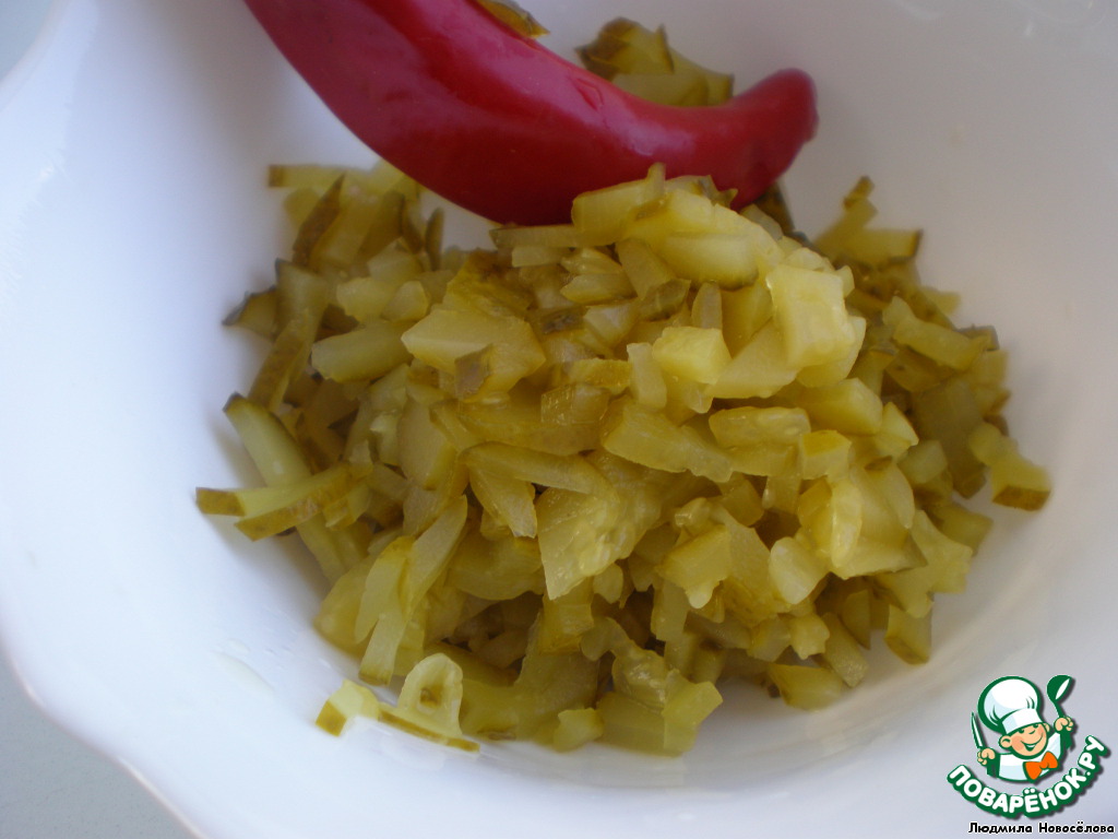 Мелко нарезаем огурчики и перец горький (1/2 чайной ложки)