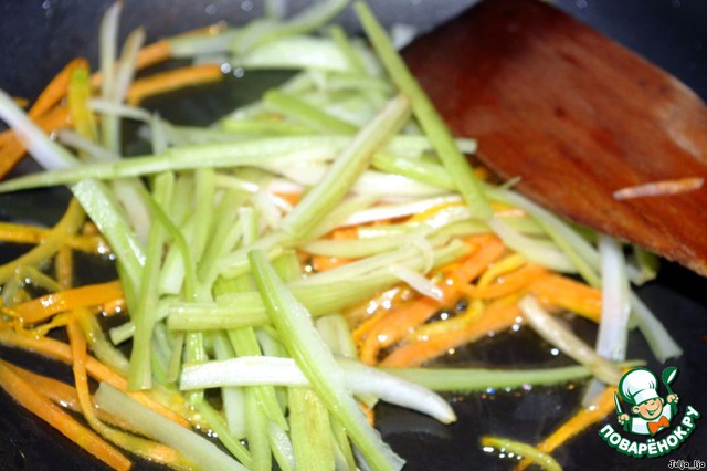 Добавим сельдерей, также нарезанный длинной соломкой.
