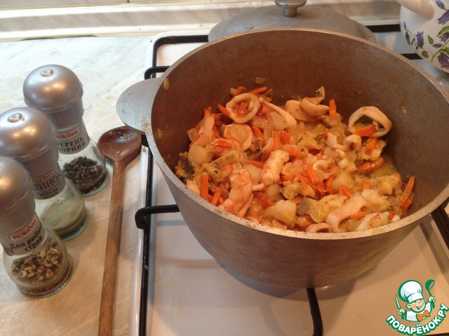 Рис промыть, просушить на полотенце, всыпать в сотейник и добавить кипяток (!) (я налила 200 мл, потому что морепродукты пустили много сока). Добавить приправу для плова, перемешать.