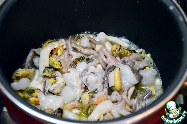 Размораживаем коктейль из морепродуктов и сливаем жидкость. В широкой сковороде нагреваем масло, обжариваем морепродукты в течение 2-3 минут на сильном огне и откладываем в сторону.