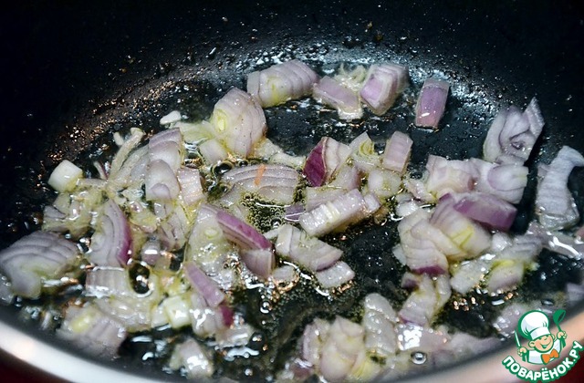 В этой же сковороде пассеруем мелконарезанный репчатый лук до прозрачности.