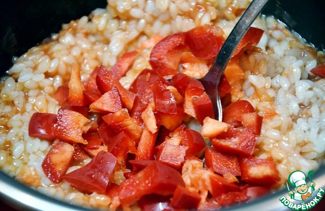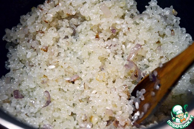 Всыпаем рис и перемешиваем. Обжариваем рис, помешивая, пару минут.