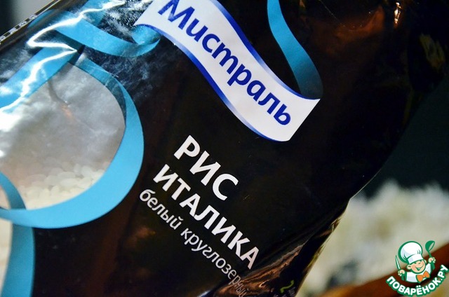 Я взяла белый круглозерный рис Италика ТМ Мистраль. Вливаем в рис кипящую воду, так чтобы она покрыла рис на палец. Убавляем огонь до среднего, солим. Общее время приготовления составляет около 20 минут. После добавления воды рис не надо мешать.