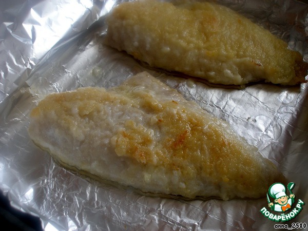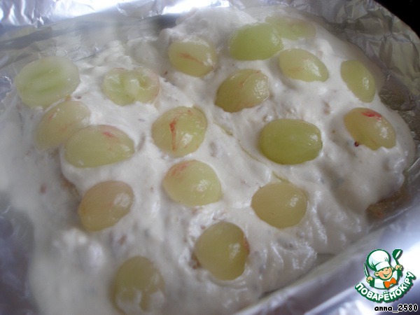 Заливаем рыбку соусом, сверху выкладываем разрезанный на половинки виноград. Ставим форму в разогретую духовку на 10-15 минут. Через 10 минут посыпьте рыбку натертым пармезаном (помните, кусочек оставляли?!) и оставьте в духовке еще на 5 минут.