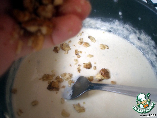 Грецкие орехи порубить на небольшие кусочки (я просто прокатываю скалкой по пакету с орешками) и добавить в соус. Прогревать на маленьком огне до тех пор, пока сыр практически весь расплавится и соус станет густым. Снимаем с плиты.