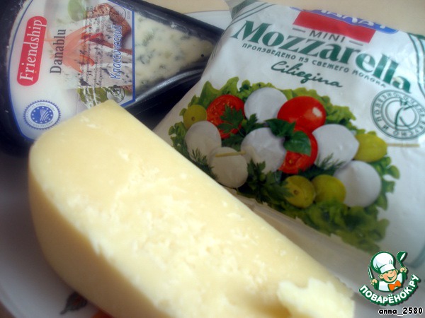 Вот наш сыр: моцарелла, дана блу и пармезан. Выбор сыра - на ваш вкус. Желательно, чтобы сыры были разные по текстуре и по вкусу. Но главное, чтобы выбранный сыр вам нравился!
