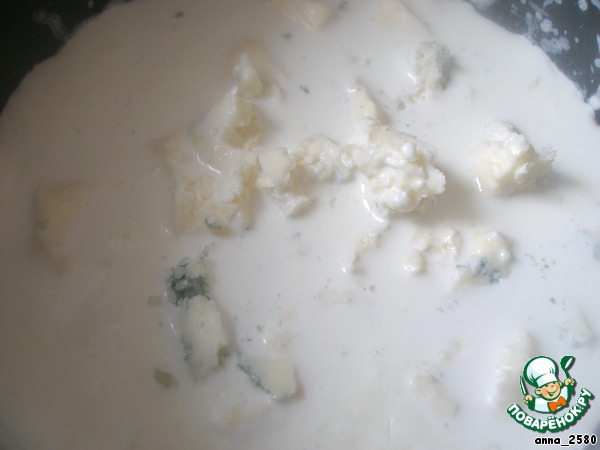 Сыр нарезать небольшими кусочками и отправить в сливки. Оставьте немного пармезана - его мы позже натрем на терке и посыпем на почти готовое блюдо.