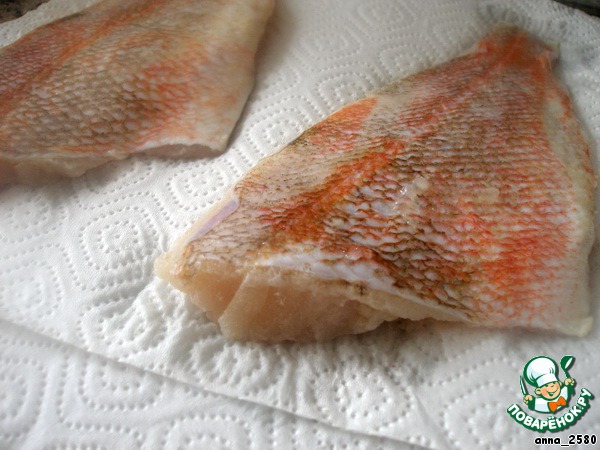 Филе окуня разморозить (если оно было заморожено), обсушить на бумажном полотенце. Полить лимонным соком и оставить на 10 минут.