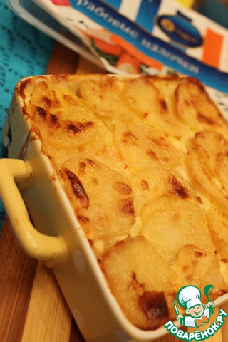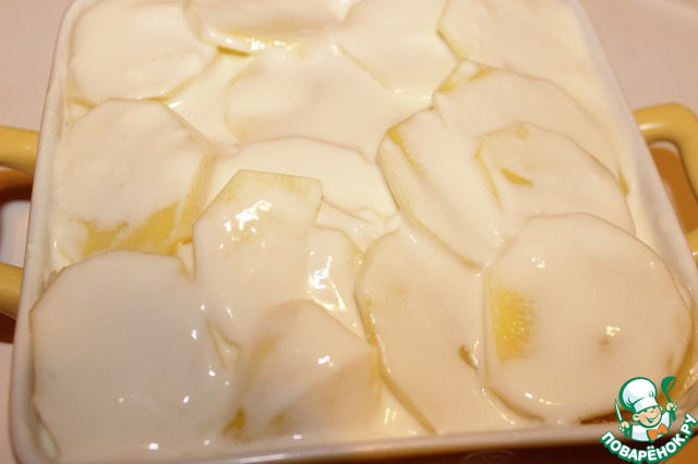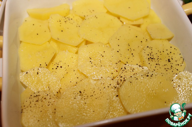 Очищенный картофель нарезать тонкими кольцами. Половину картофеля выложить в жаропрочную посуду, выровнять, посыпать солью и щепоткой перца. Черный перец можно заменить на белый.