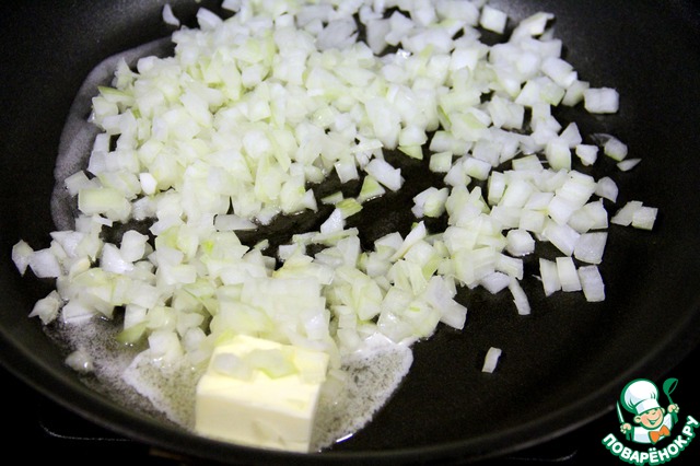 Сначала делаем соус. В небольшой сковороде растопить сливочное масло, положить лук и пассировать до мягкости.