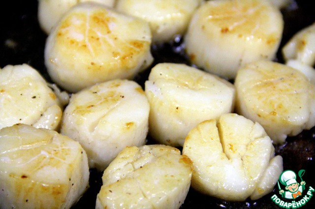 Затем добавить к гребешкам соус, перемешать, накрыть крышкой и дать постоять минуты 2-3.