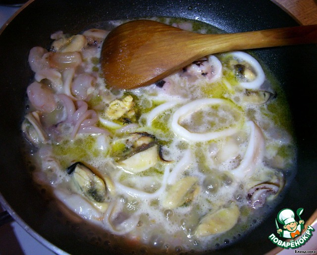 Вынимаем из масла чеснок и отправляем в сковороду морепродукты, посыпаем приправами. Тушим около 1 минуты, выделившийся «бульон» сливаем в отдельную емкость, добавляем соевого соуса и обжариваем еще минутку.