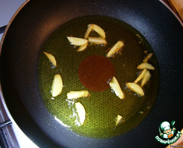 В глубокой сковороде разогреваем оливковое масло и отправляем туда чеснок, держим на медленном огне, чтоб он отдал свой аромат (но не зажарился и не почернел!).