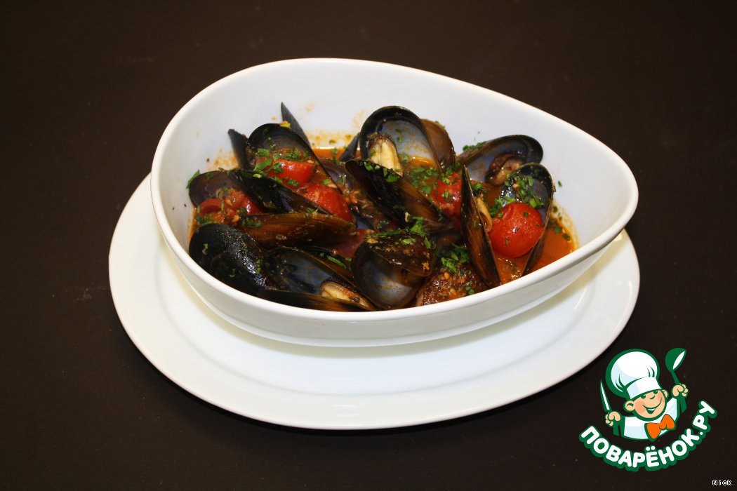 Мидии чистим, чеснок и петрушку мелку рубим, обжариваем на оливковом масле, добавляем мидии, помидоры черри и гасим белым вином. Добавляем рыбный бульон, доводим до кипения, солим, перчим.