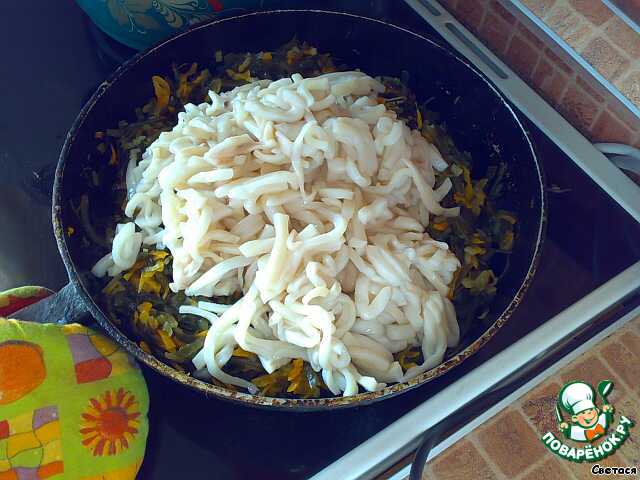 Кальмар разморозить, залить на пару минут кипятком, воду слить, снять плёночку. Порезать длинными полосками.