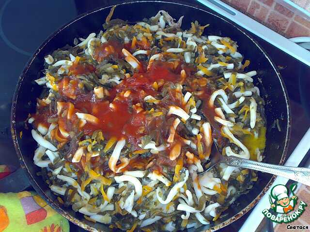 Когда солянка закипит, добавить томатный соус, посолить, поперчить. Дать покипеть ещё 2 минуты. Выключить огонь. Сковороду убрать с плиты, иначе кальмар будет жесткий.