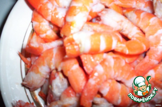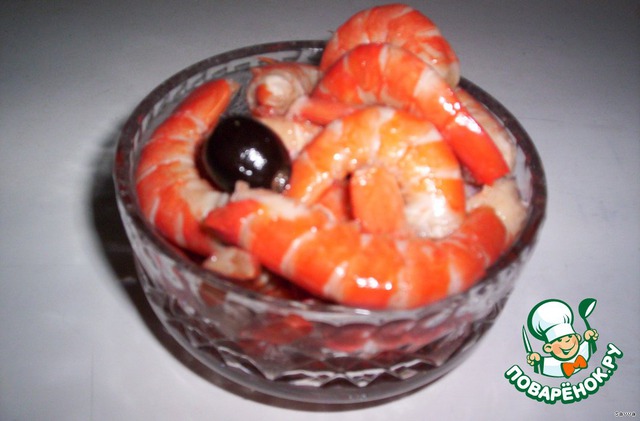 - в емкость сложить креветки, залить соком маслин и жидкостью, которая стекла с панцирей