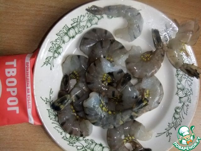 Сырые тигровые креветки разморозить, промыть и очистить от панциря.
