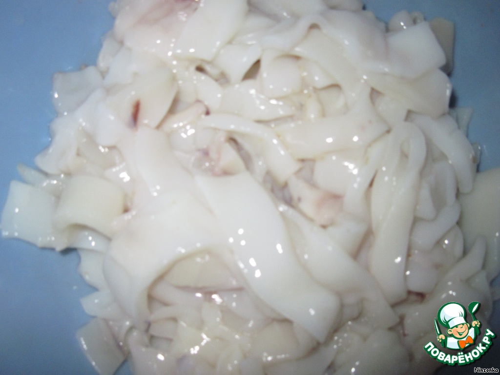 Кальмаpы нарезать соломкой.