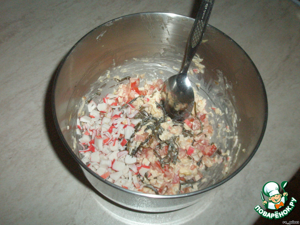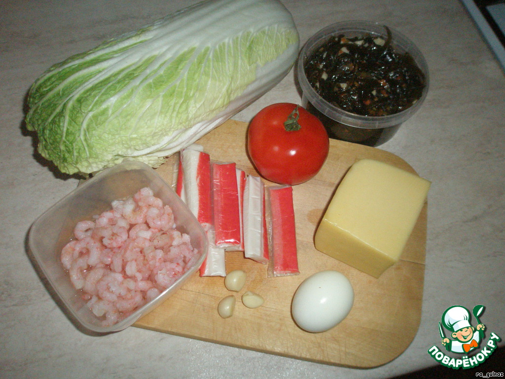 Выкладываем на тарелку два листа китайской капусты (один вниз, другой лист сворачиваем в ракушку). Берём приготовленные из теста 2 створки для жемчужины. В одну кладем наш салат, другой накрываем сверху и посыпаем тёртым сыром. Нашу жемчужину кладём в ракушку.