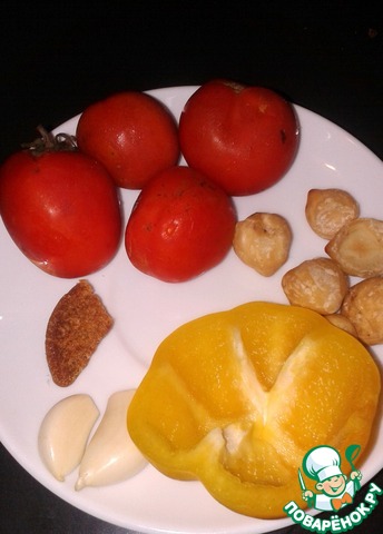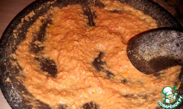 Как я уже сказала, всё дело в соусе! Итак, приступим! Помидоры обдали кипятком, сняли кожицу и вырезали сердцевинку. Орехи, чеснок, перец и помидоры кладём в блендер, добавляем сахар и измельчаем. Если есть возможность измельчить в ступе, то лучше будет консистенция. Как я говорила ранее, здесь до сих пор никто не пользуется блендерами и не просто так.