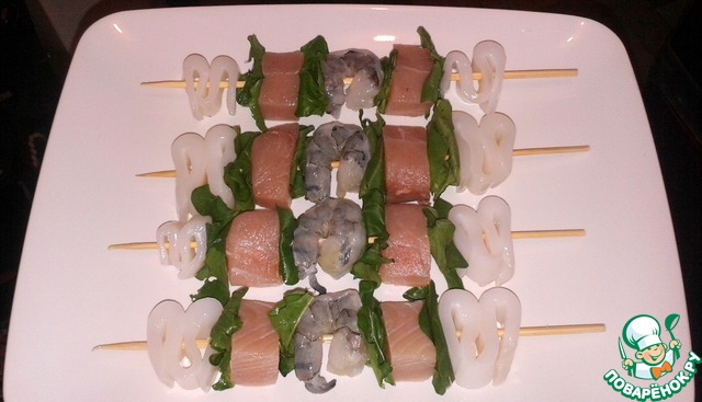 Одеваем на шпажку свободненько в произвольной последовательности, не впритык, можно проредить травкой, у меня была руккола, она как ничто подходит к морепродуктам. И выкладываем на плоское блюдо. У меня получилось так.