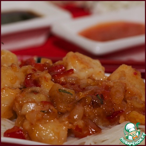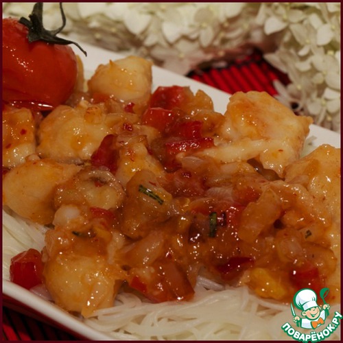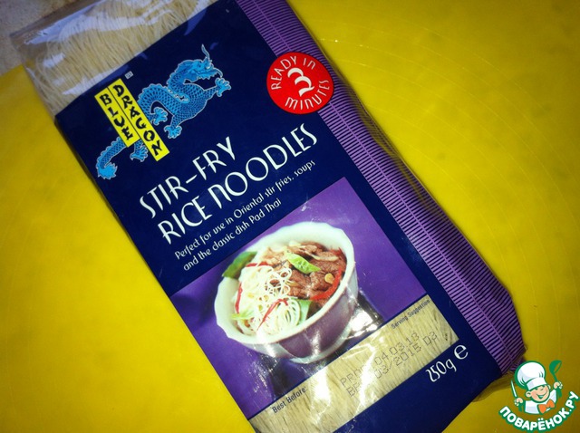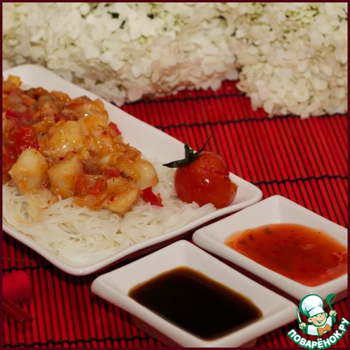 Рисовая лапша с морскими гребешками в сладком соусе чили