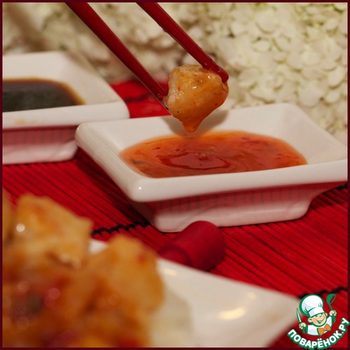 Готовим соус: смешать сладкий Соус Чили, соус устричный, сладкий Чили и Имбирь Соус. Использовала продукцию Blue Dragon.