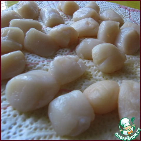 Разморозить мускул морского гребешка в холодильной камере. Затем промыть и аккуратно обсушить кусочки морского гребешка, чтобы убрать лишнюю влагу.