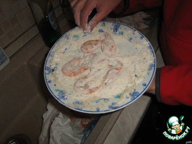 Смешиваем муку, зелень, любимые специи и измельченный чеснок. Обваливаем креветки.