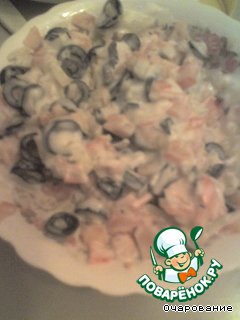 Затем измельчить, соединить со всеми продуктами. Приготовить соус: лук нарезать крошкой, помидор мелким кубиком, маслины кружочками, все соединить, заправить майонезом. При подаче полить салат этим соусом. Приятного аппетита.