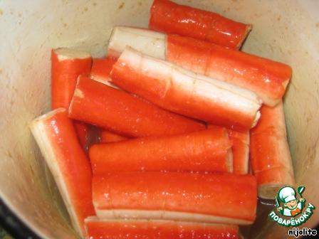 Крабовые палочки режем пополам и заливаем полученным маринадом.