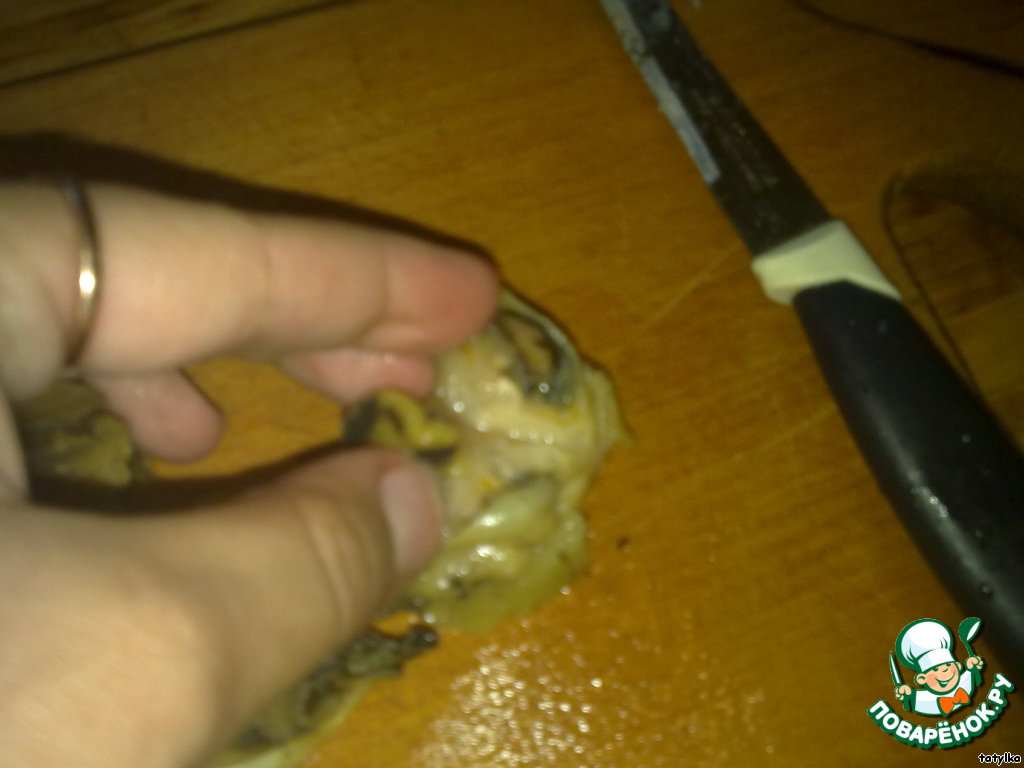 Делаем продольный разрез ножом (не до конца) в передней части рапана.