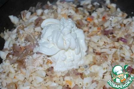 15. Дать смеси немного остыть, чтобы не обжечь пальцы. Добавить измельченную зелень петрушки. Далее начинить смесью мудро припасенные для этого случая половинки панциря. Посыпать тертым сыром. И в духовку, разогретую до 180 градусов. Когда сыр зарумяниться, можно вынимать.