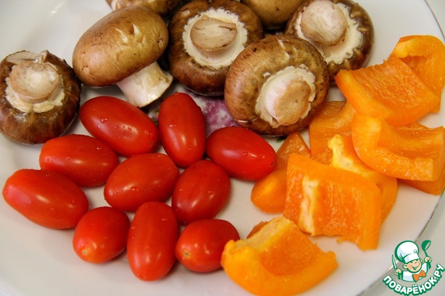 Помидоры и грибы помыть, перец нарезать на квадраты.