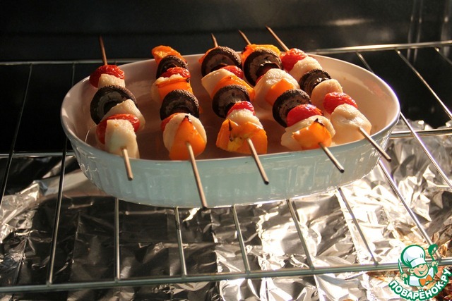 На шпажки насадить чередую морские гребешки, перец, грибы и помидоры.