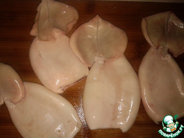 1. Кальмары моем, очищаем от шкурки, и отвариваем по одному в кипящей, крепко посоленной воде, по 10 секунд каждый.