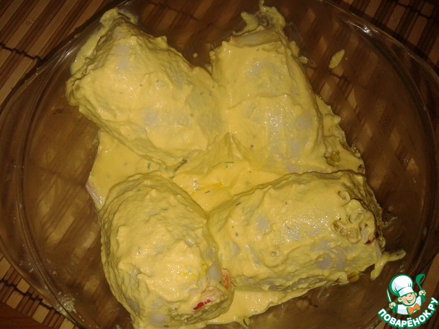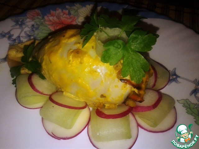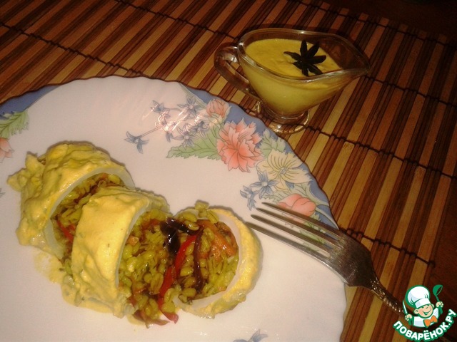 Кальмары фаршированные перловкой под нежным сливочно-морковным соусом