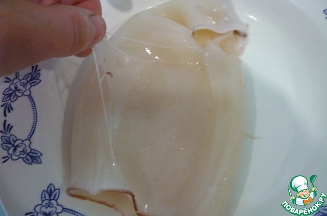 Теперь мы обязательно удаляем и снаружи, и изнутри тонкую пленку, именно из за нее кальмары съеживаются и становятся меньше.