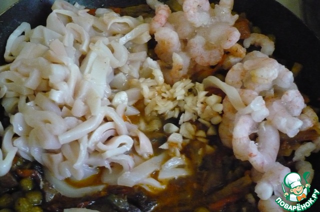 За это время подготовим кальмары: мы их размораживаем в холодной воде, затем опускаем в горячую, снимаем шкуру и удаляем внутренности. Но это еще не все.