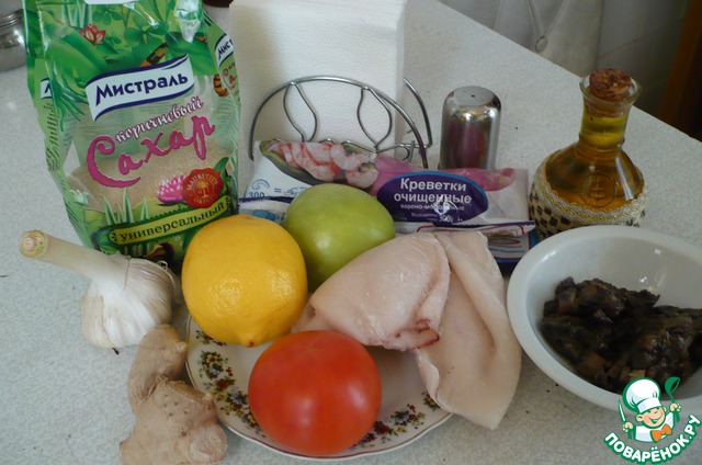 Ну вот, теперь их можно порезать соломкой и вместе с креветками и резаным чесноком положить в сковородку. Добавить специи, сок лимона, сахар. Накрываем крышкой, доводим до кипения, перемешиваем и через 1 минуту снимаем с огня.