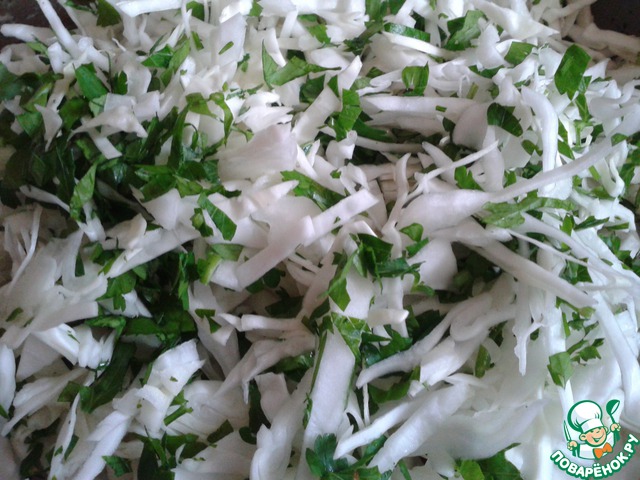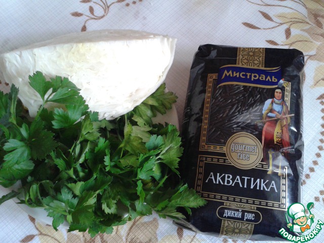 Капусту и петрушку мелко нашинкуем, тушим на сливочном масле, с добавлением черного перца. Рис предварительно отварим. Все компоненты соединим.