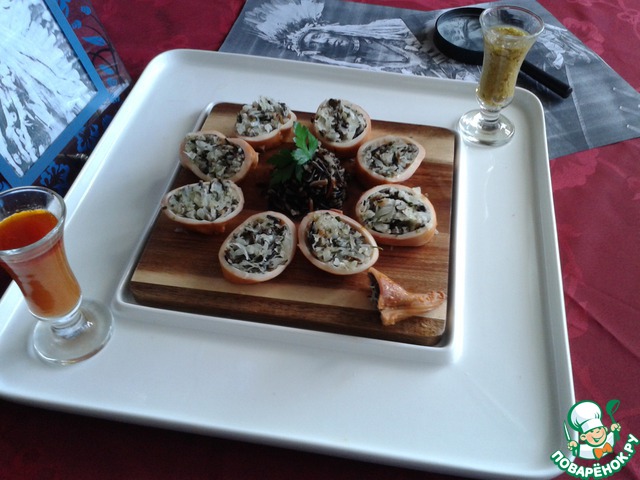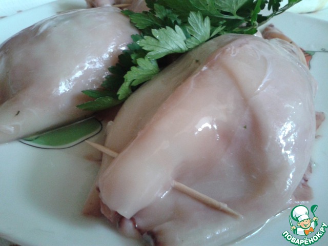 Кальмары очистим, зафаршируем готовой начинкой, заколем зубочисткой.